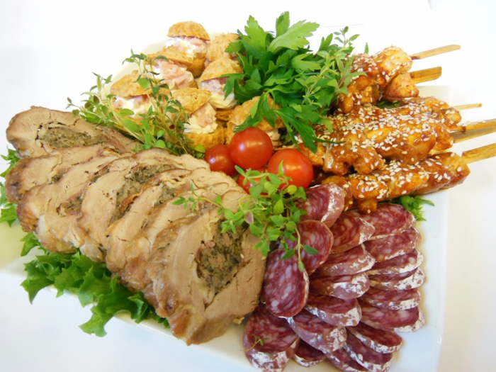 Korvikesed kanamaksapasteedi ja paradiisiõunaga, täidetud baklažaanid, ahjusealiha, suitsukanafilee. |