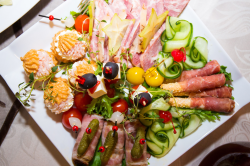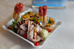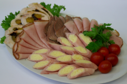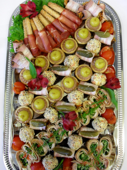 Singirullid juustu-küüslaugutäidisega, ahjusealiha, suitsukanafilee, salaamivorst või keedetud veisekeel, kirsstomat. |