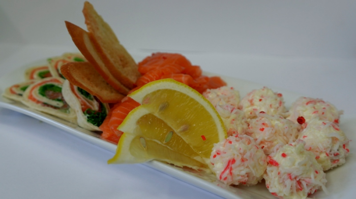 Soolalõhe, tortiljarullid lõhega, kalapallid "Raffaello", sidrun |