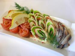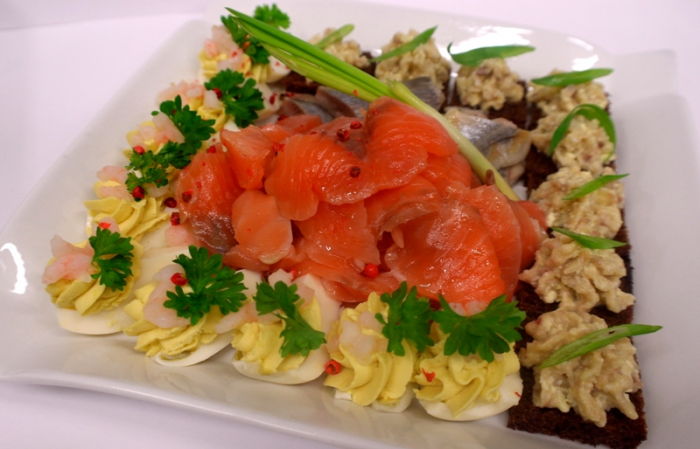 Soolalõhe, täidetud munad, minileivad heeringapasteediga, sidrun, kaunistus |