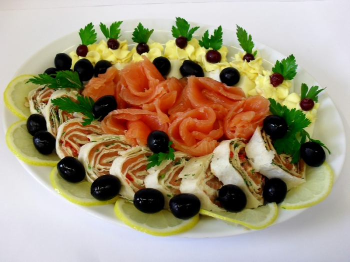 Soolalõhe, tortiljarullid lõhega, täidetud munad, oliivid, sidrun. |