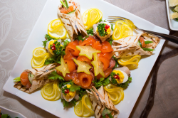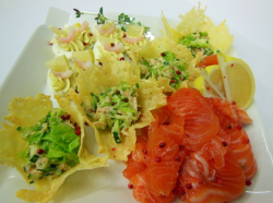 Soolalõhe, täidetud munad, parmesanikorvikesed lõhesalatiga, sidrun, kaunistus |