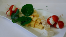 Valgehallitusjuust Camembert, mozzarella juust kirsstomatiga, brõnza, juustukuubikud vürtsidega. |